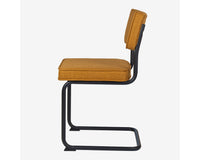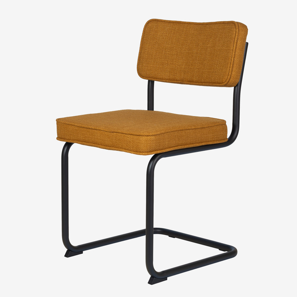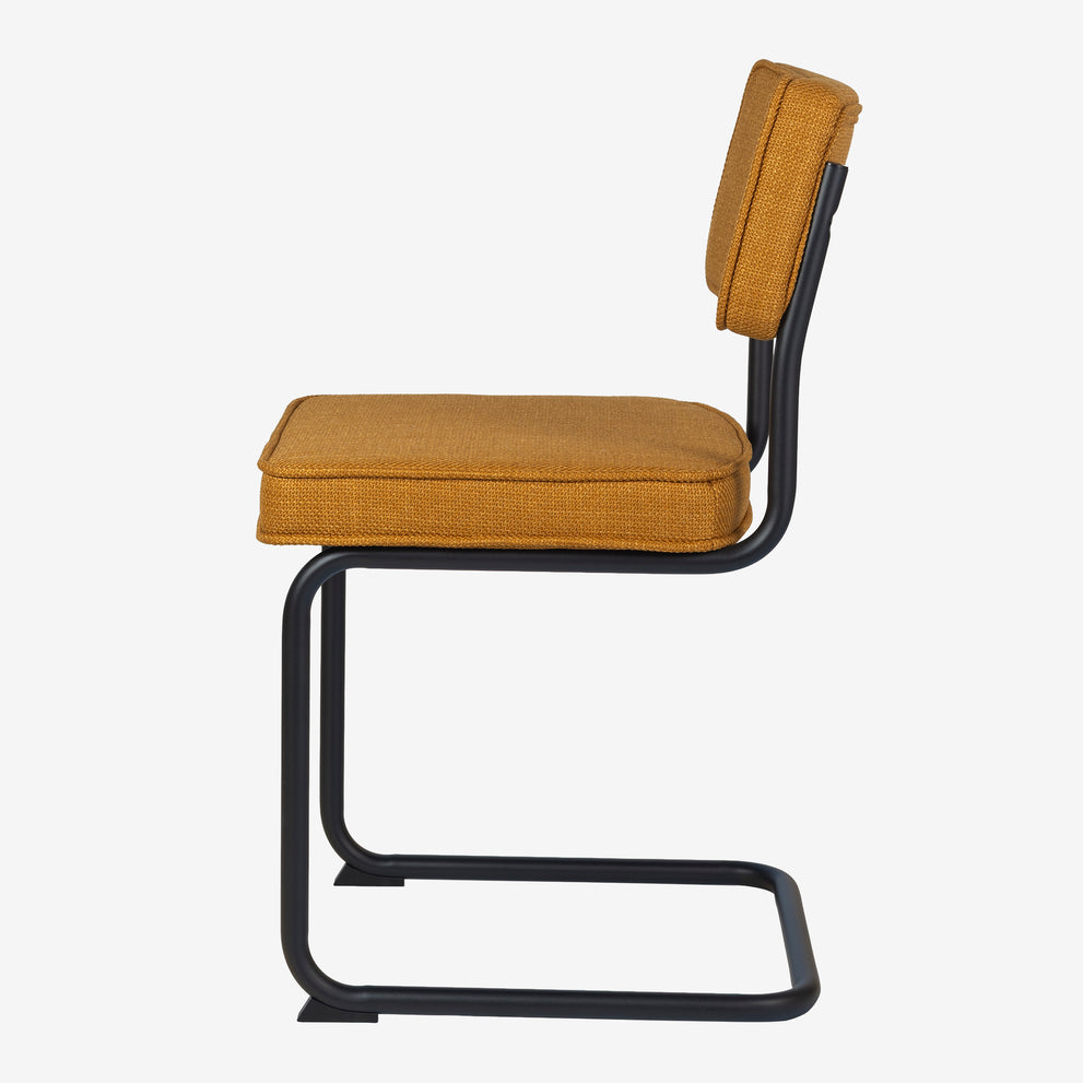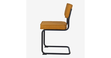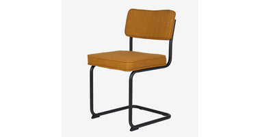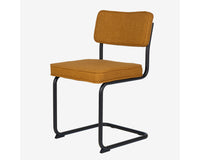 Deze Brovst eetstoel met zwart frame is dezelfde stoel als onze bekende Brovst stoel in de ribstof. Afmetingen en zitcomfort zijn identiek.