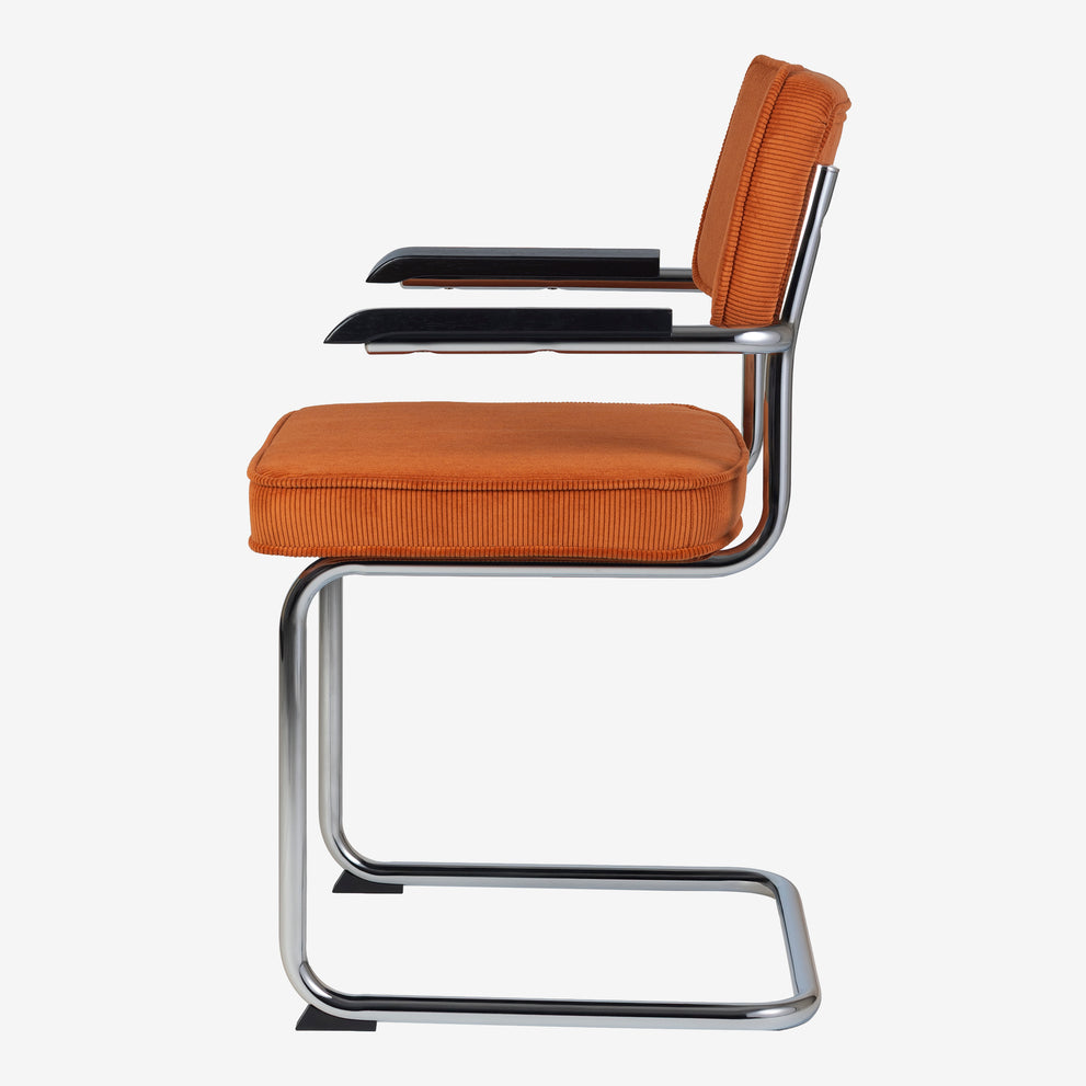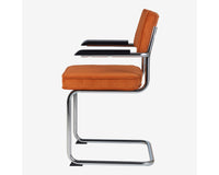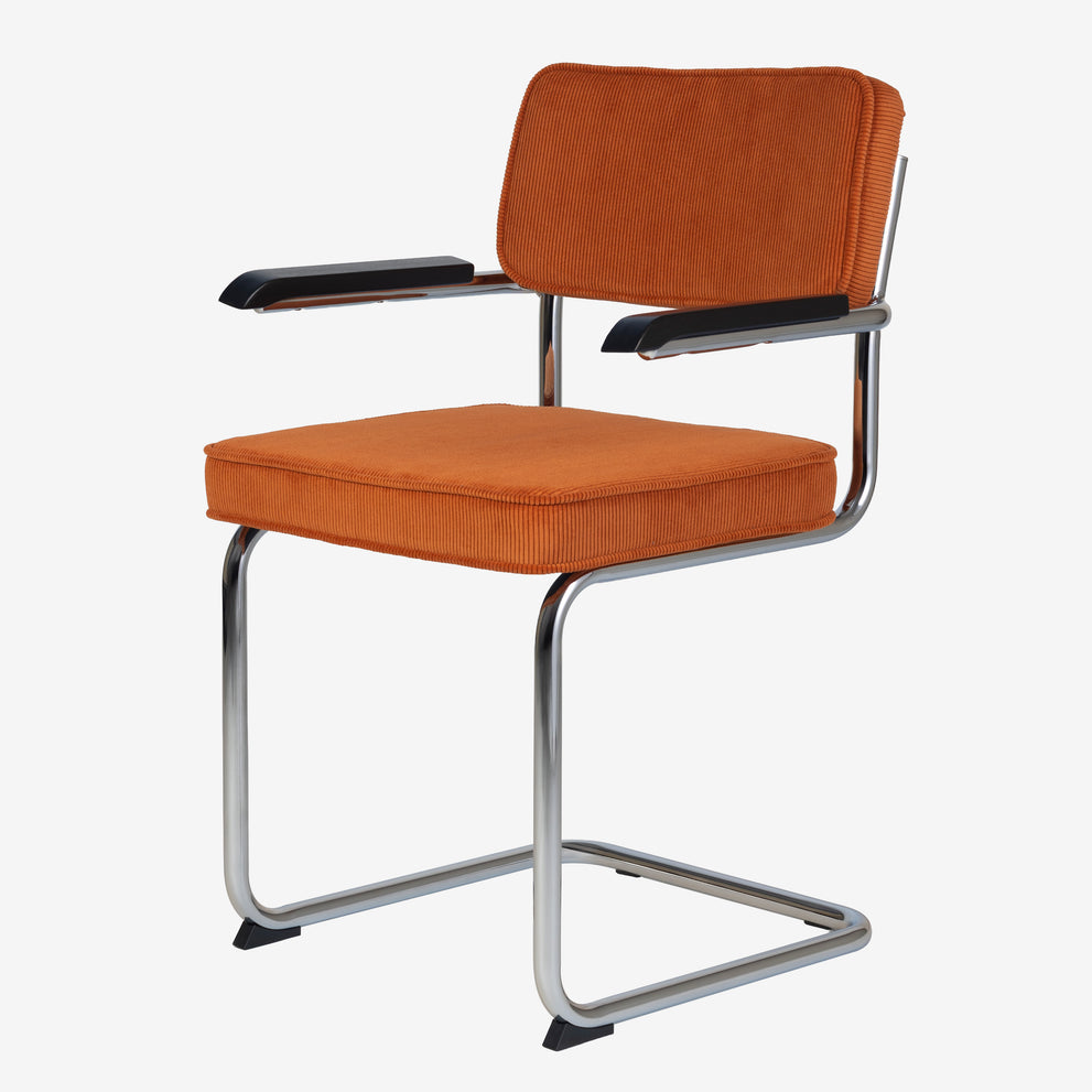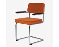 Eindelijk komt ie weer !! Onze bekende buisframe stoel Brovst MET armleuning. De armleuning is gemaakt van hout en is zwart gelakt. Stoel is identiek aan de stoel zonder arm behalve dat ie door de armleuning iets breder wordt.