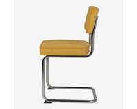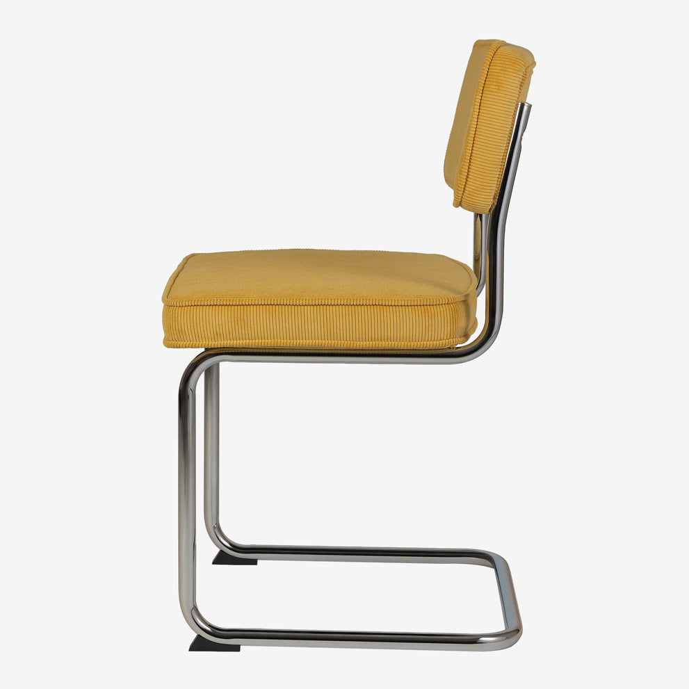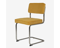 Onze buisframe eetkamerstoel Brovst met glanzend chromen frame en corduroy ribstof is een prachtige combinatie van vintage design en modern comfort. De stoel is geïnspireerd op de Gispen stoel uit de Bauhaus periode. Het chromen frame heeft een strakke, industriële uitstraling. De Bauhaus periode kenmerkt het principe : vorm volgt functie. De stoel krijgt hierdoor ook een minimalistische look.