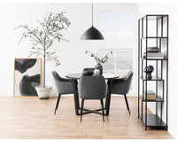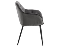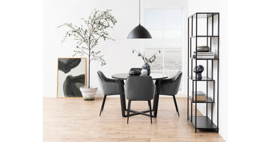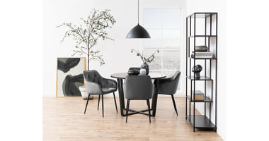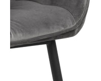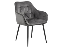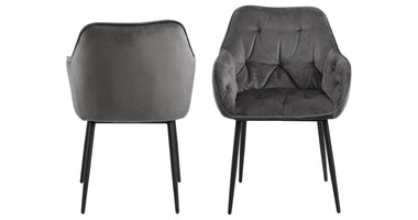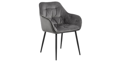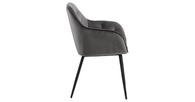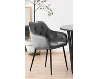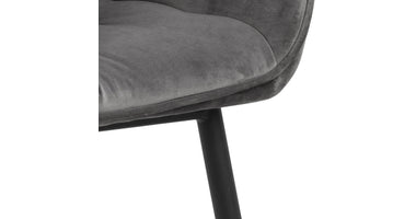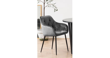 Geef je eethoek karakter met deze comfortabele eetstoel Gjol. Gestoffeerd in een zachte grijze stof is deze eetkamerstoel geschikt voor lang tafelen. De getufte details in de rug en binnenzijde arm voegen textuur en structuur toe aan de zitting. De schuine poten zijn zwart gepoedercoat. Door het fluweel verandert de stof van kleur, afhankelijk van het licht en de richting van de pool, waardoor het een levendig, rijk gevoel krijgt.