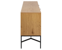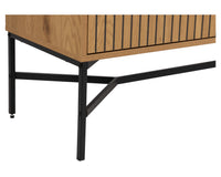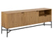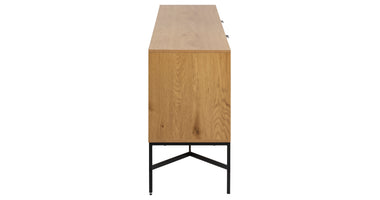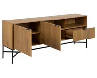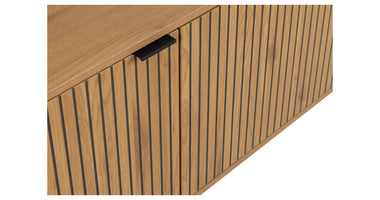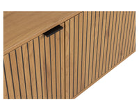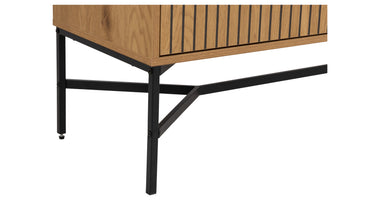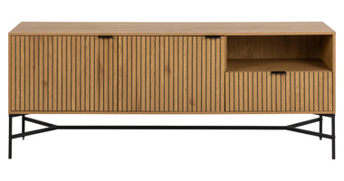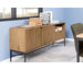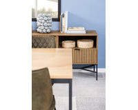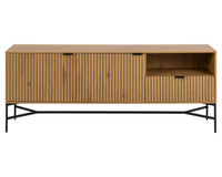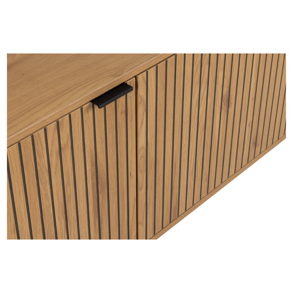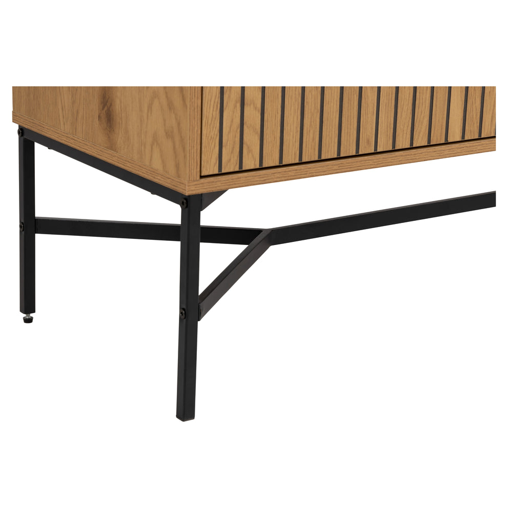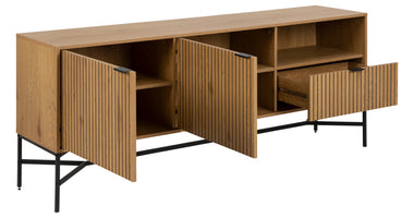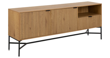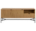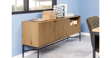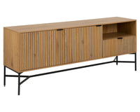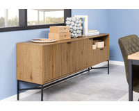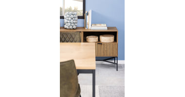 Dressoir Holeby laat zien hoe het moet. Met een onberispelijke, minimalistische look is het meer dan alleen een plek voor je spullen. Kijk maar eens naar die lamellenfronten met de elegante handgrepen in hetzelfde ruwe gepoedercoate metaal als het onderstel. Het dressoir heeft 2 deuren, een lade met daarboven een open vak.