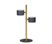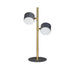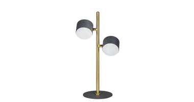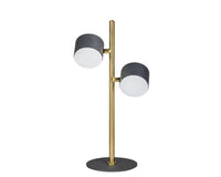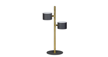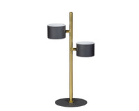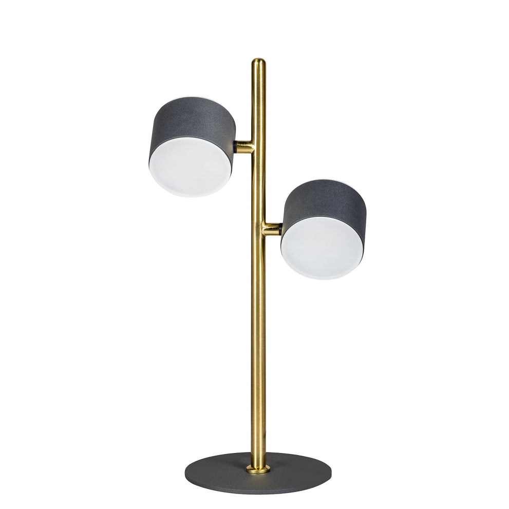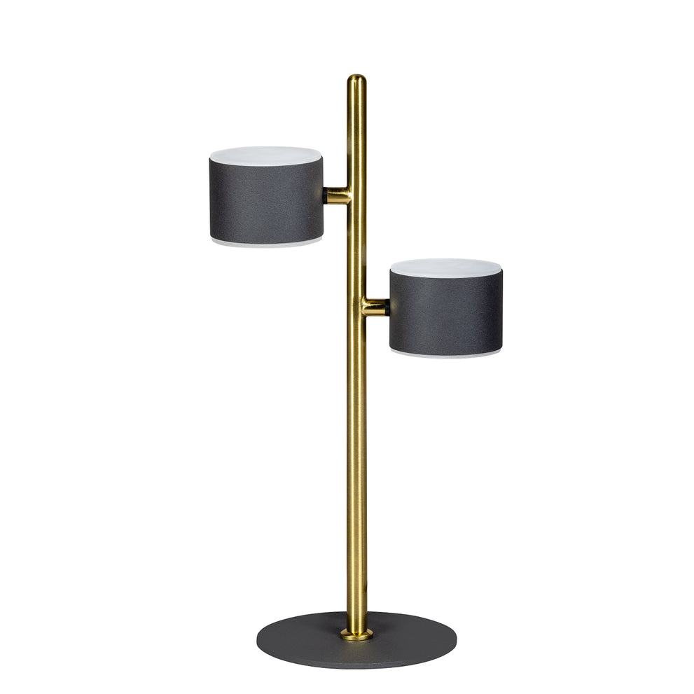 Tafellamp Prince van ETH Expo Trading in de kleurstelling zwart-goud. De hoogte van de lamp is 52cm en de 2 cilinders zijn te draaien. Door de twee witte kunststof schijven op elke cilinder straalt deze lamp het licht naar twee kanten uit.