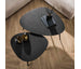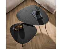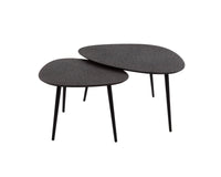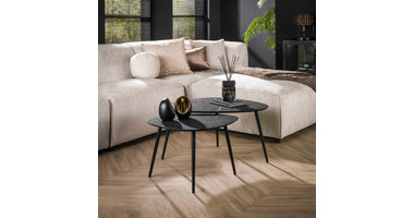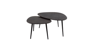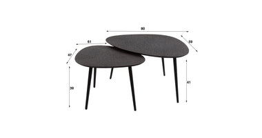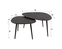 Deze trendy 2-delige salontafelset Hanau in een driehoekige vorm is uitgevoerd in 'metallic' zwart. Op het blad zit een hele mooie bewerking welke een unieke uitstraling geeft. De tafels kunnen naar eigen inzicht speels bij elkaar neergezet worden.