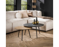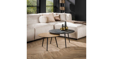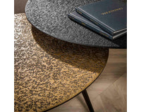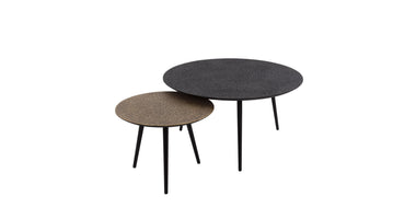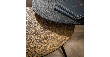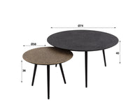 Deze ronde 2-delige salontafelset Hanau is uitgevoerd in de combinatie 'metallic' zwart en brons antiek. Op het blad zit een hele mooie bewerking welke een unieke uitstraling geeft. De tafels kunnen naar eigen inzicht speels bij elkaar neergezet worden.