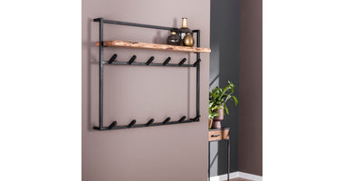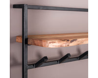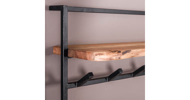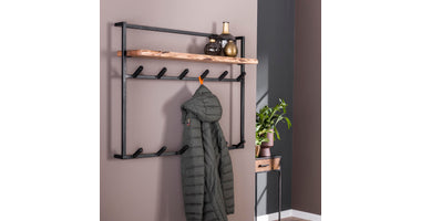 Deze kapstok Bogen is voorzien van een hoedenplank gemaakt van massief acacia hout. Zorgvuldig geselecteerd hout, voorzien van een fijne nerf en diverse noesten, die op ambachtelijke wijze wordt verwerkt. Dit zorgt voor een natuurlijke én unieke look aan de wand. Aan de hoedenplank zijn er 6 zwart geschuurde metalen haakjes bevestigd en deze zelfde haakjes zijn terug te vinden aan de onderzijde. De kapstok is voorzien van twee bevestiging ogen aan de achterzijde, zodat de kapstok eenvoudig aan de wand kan worden gemonteerd.
