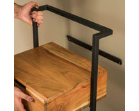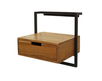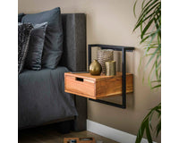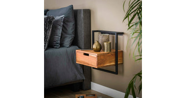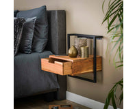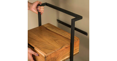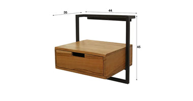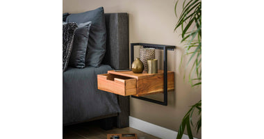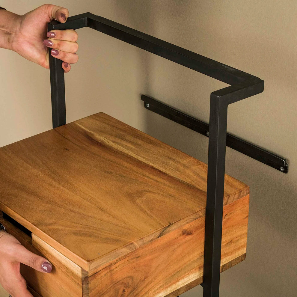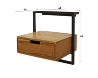 Dit nachtkastje Bockenem is uitgevoerd in metaal met acaciahout. Deze combinatie geeft dit nachtkastje een eigentijdse uitstraling en deze is dan ook heel goed te combineren met de meeste bedden. Dit nachtkastje wordt door middel van een strip met drie schroefgaten aan de muur gemonteerd, waardoor het nachtkastje hierop kan hangen. Zie hiervoor de foto. Dit nachtkastje heeft ook een bijpassend buro.