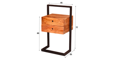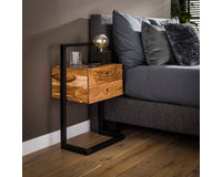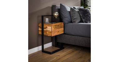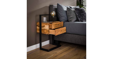 Dit nachtkastje Glinde is uitgevoerd in acacia hout in combinatie met een metalen frame. Deze is afgewerkt in zwart poedercoat. Dit model is voorzien van twee lade. Aan de achterkant van het kastje kan deze aan de muur gemonteerd worden voor meer stevigheid. Dit nachtkastje heeft een stoere en eigentijdse uitstraling en komt dan ook in veel woningen tot haar recht.