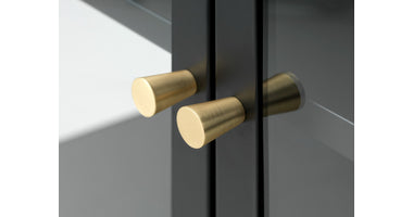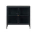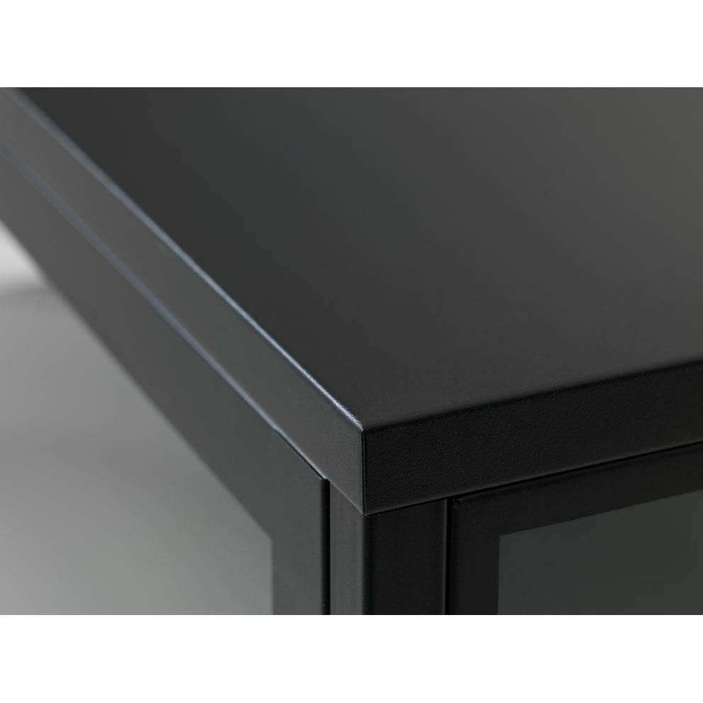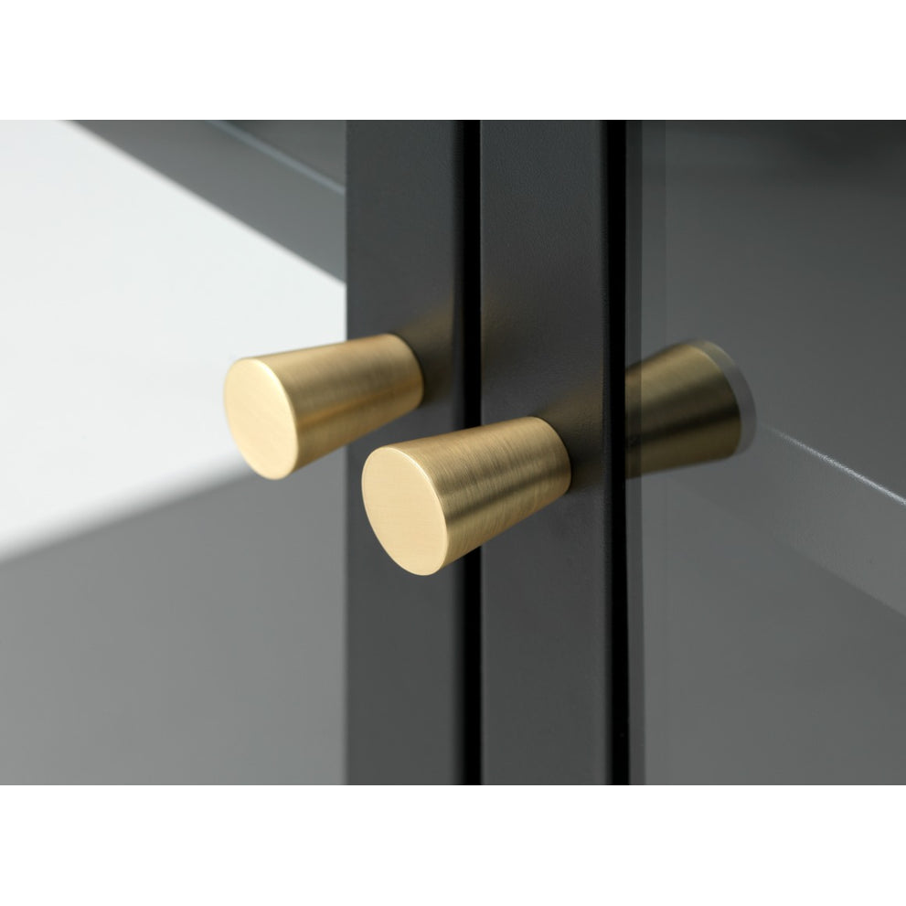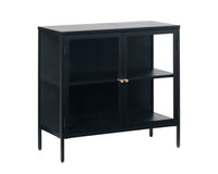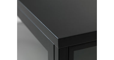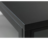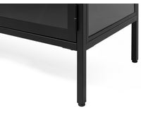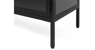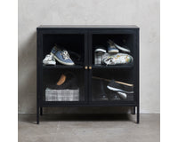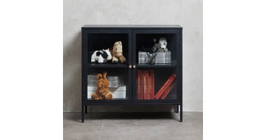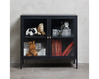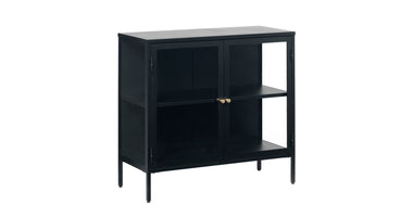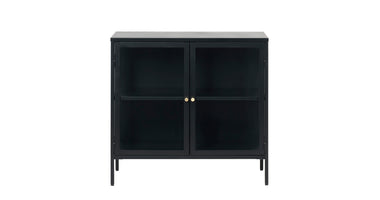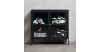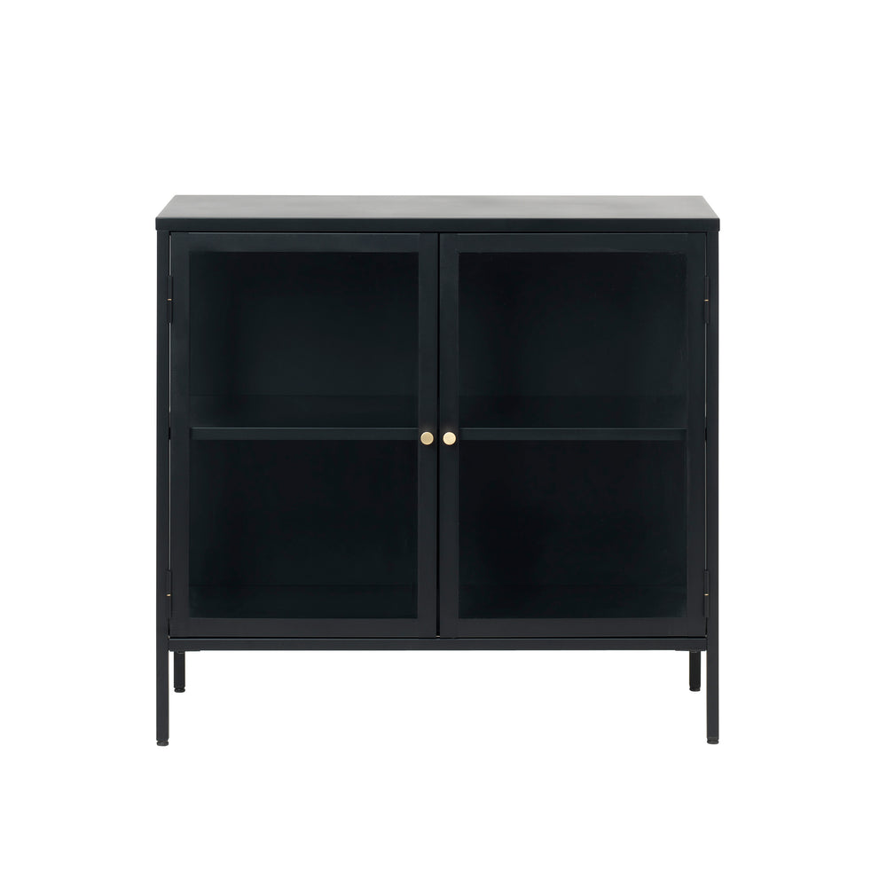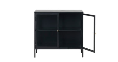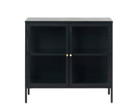 De dressoirs en vitrinekasten van deze Aarhus serie zijn gemaakt van zwart metaal en heeft deuren met gehard glas. Bovenbladen zijn ook van metaal zodat je er mooi iets op kunt plaatsen. De combinatie van zwart metaal met glas zorgt voor een industriële uitstraling. Deuren zijn voorzien van een goudkleurige knoppen want een mooi accent geeft. Kasten zijn allen zelfmontage wat door de goede handleiding uitstekend te doen is. Hierdoor laat het zich beter verpakken en is het minder kwetsbaar in het transport.