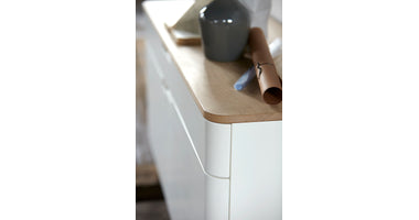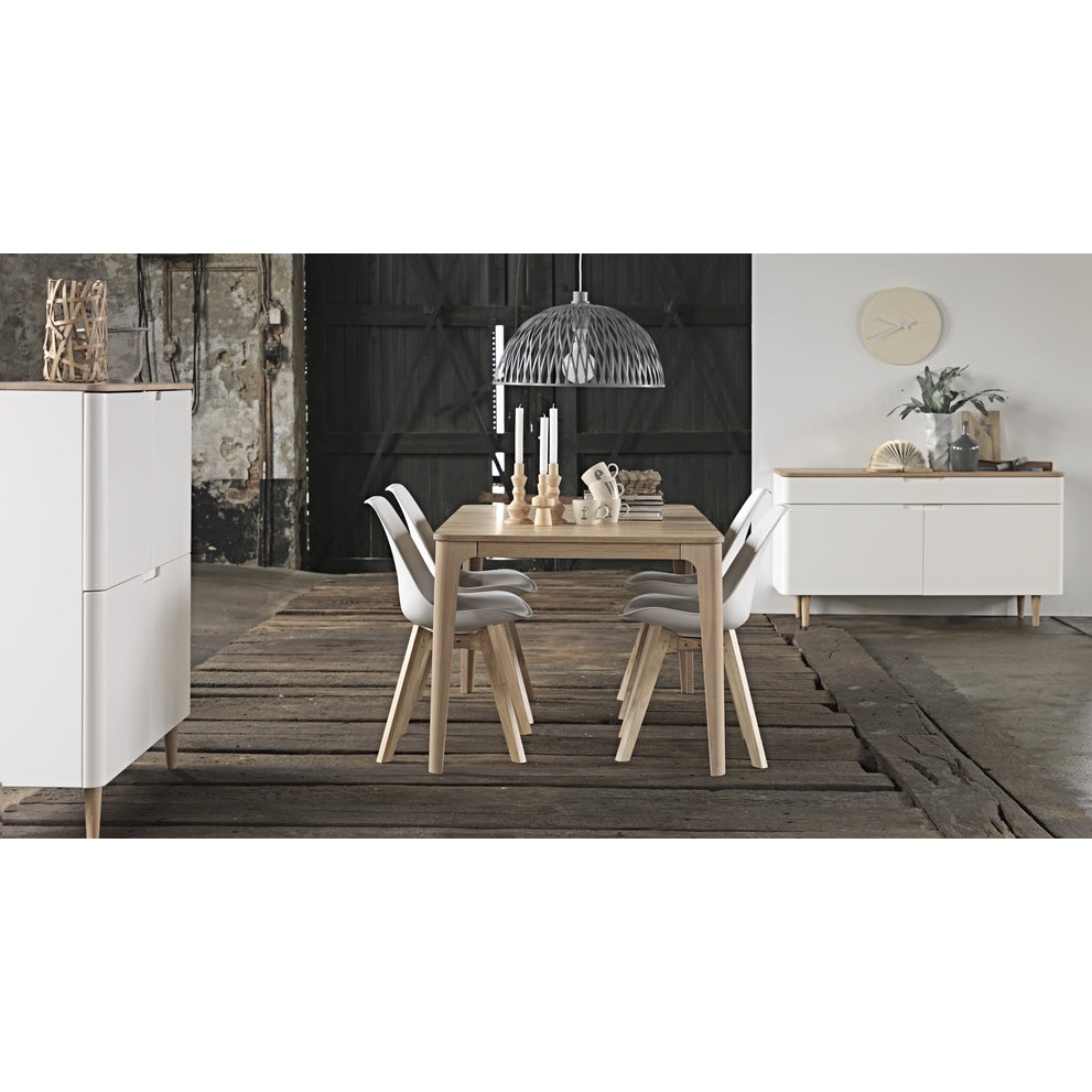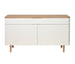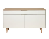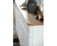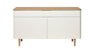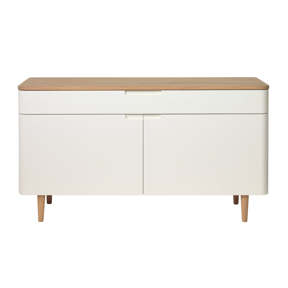 Dressoir Rodby heeft 2 deuren en 1 lade en is een luxe combinatie van white wash eiken afwerking met wit gespoten MDF. De Rodby collectie heeft mooie gebogen lijnen en vormen, geheel in de stijl van de Deense sixties design stijl.