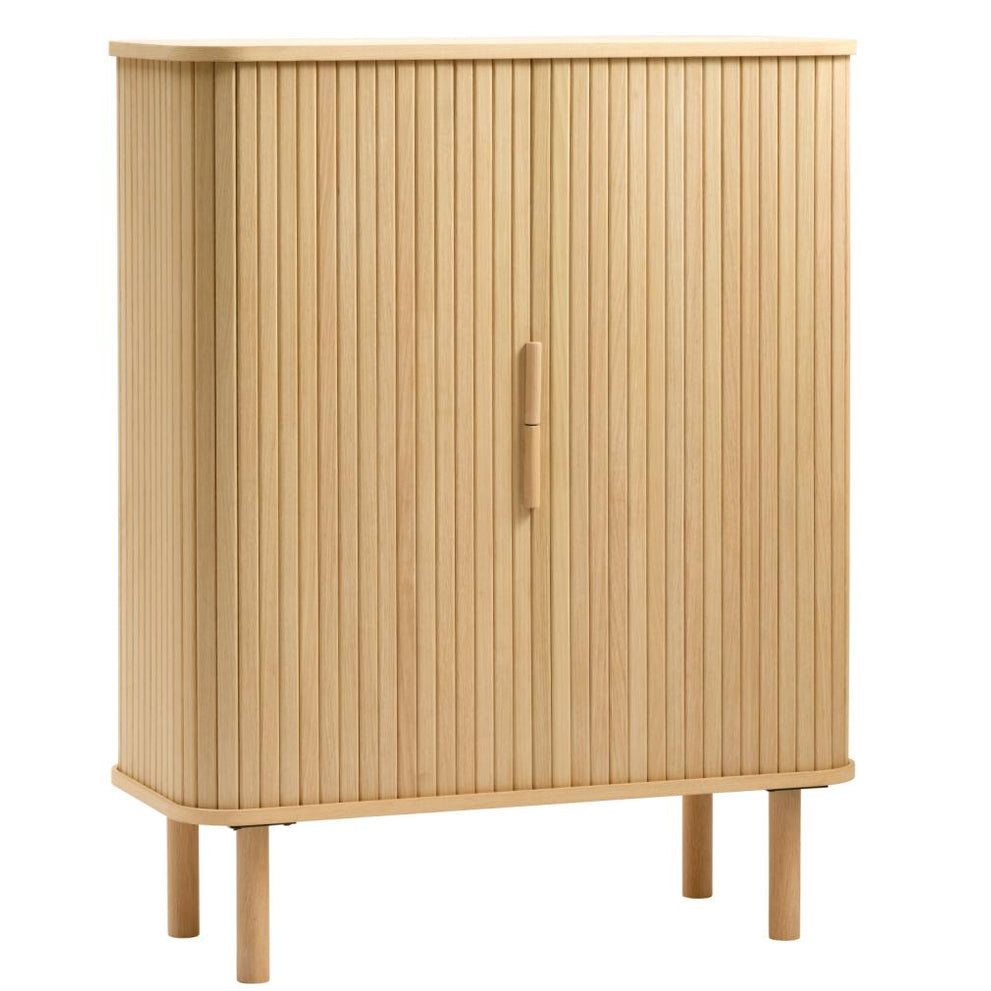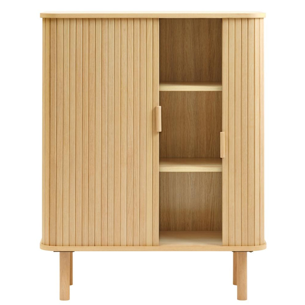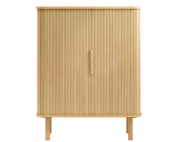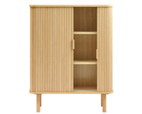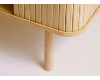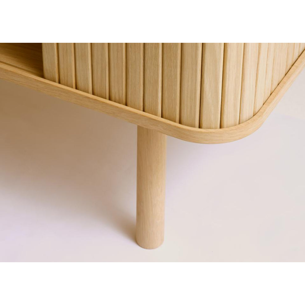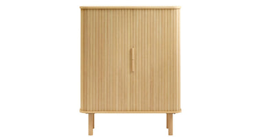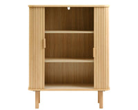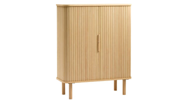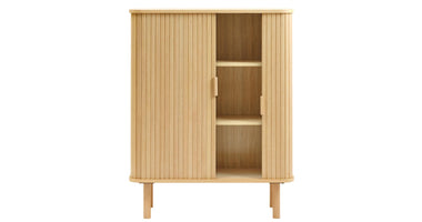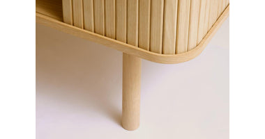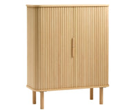 De Randers meubel collectie heeft een Scandinavische look net als de Kolding serie. De ronde hoeken in combinatie met de lamellen schuifdeur zorgen voor een stijlvol meubel. Door de schuifdeuren heb je geen last van in de weg zittende openslaande deuren. Ook leverbaar in zwart eiken en bruin gerookt eiken. Deze kasten uit de Randers serie zijn iets hoekiger (maar natuurlijk wel rond) dan de Kolding serie. Tevens hebben de Randers kasten houten poten in de kleur van het meubel en hebben de Kolding kasten zwarte metalen poten. De serie meubelen bestaat uit een tv meubel, een dressoir en een hoge bergkast.