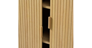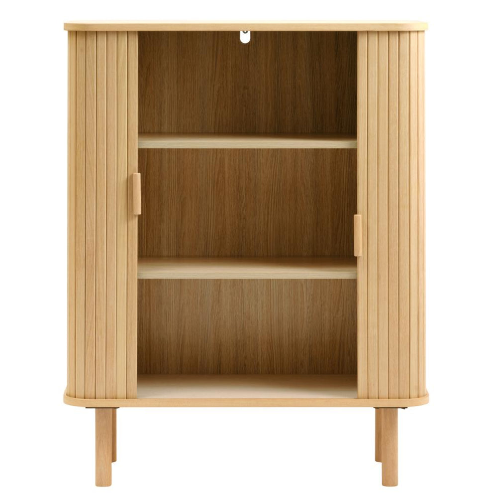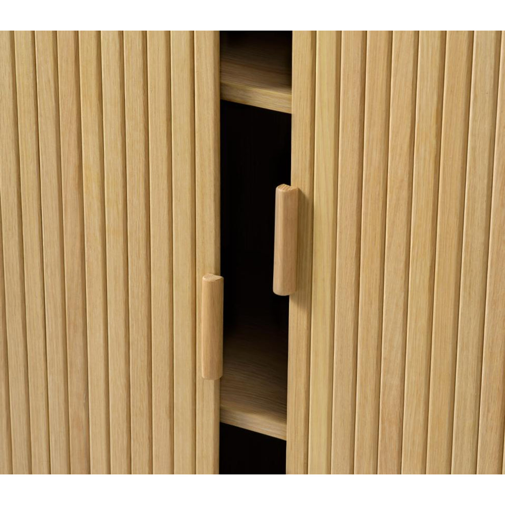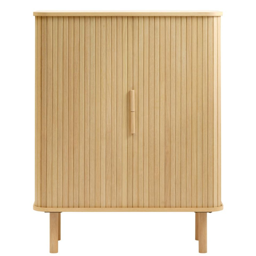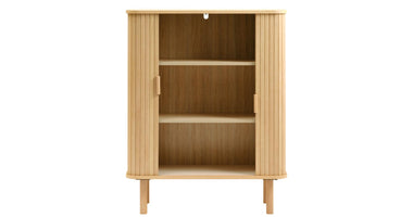 De Randers meubel collectie heeft een Scandinavische look net als de Kolding serie. De ronde hoeken in combinatie met de lamellen schuifdeur zorgen voor een stijlvol meubel. Door de schuifdeuren heb je geen last van in de weg zittende openslaande deuren. Ook leverbaar in zwart eiken en bruin gerookt eiken. Deze kasten uit de Randers serie zijn iets hoekiger (maar natuurlijk wel rond) dan de Kolding serie. Tevens hebben de Randers kasten houten poten in de kleur van het meubel en hebben de Kolding kasten zwarte metalen poten. De serie meubelen bestaat uit een tv meubel, een dressoir en een hoge bergkast.