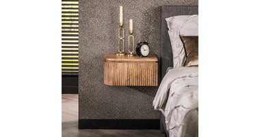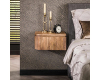 Nachtkastje Herborn is een set van 2 en is gemaakt van mango hout en heeft een eigentijds design met een golvend ladefront. De set bestaat uit een linker en een rechter nachtkastje. Het wordt bevestigd aan de muur met een strip met drie schroefgaten, waardoor het zweeft en ruimte bespaart. Zie foto.