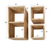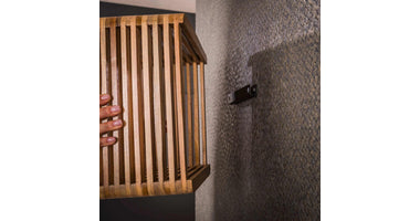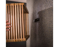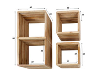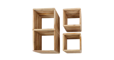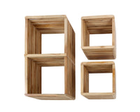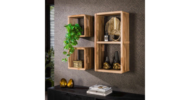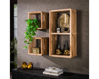 Deze set wandschappen Halver is uitgevoerd in verweerd teakhout, gelegd in strookjes. Dit geeft een heel eigentijds en speels effect aan de schapjes. De set bestaat uit drie schapjes die op verschillende wijze opgehangen kunnen worden, namelijk het grootste schap verticaal of horizontaal. De kleinere schapjes kunnen dan daarbij passend gehangen worden.