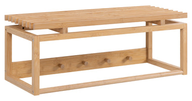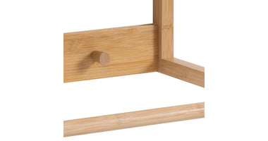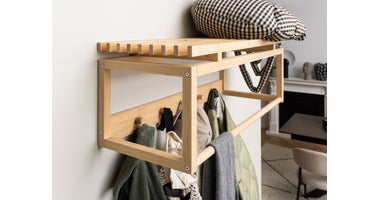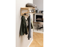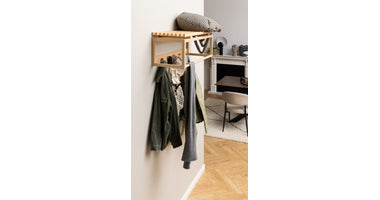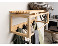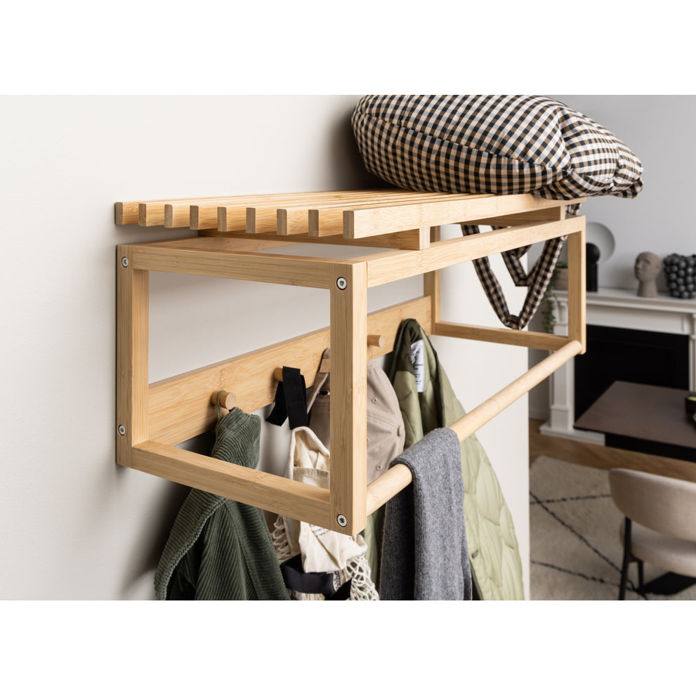 In plaats van vloerruimte in te nemen, is deze kapstok Hong ontworpen om aan de muur te hangen. Een dergelijke opbergoplossing is handig, vooral in kleine gangen. Gemaakt van bamboe met een gelakte afwerking, het heeft een natuurlijke uitstraling. Het beschikt over een kledingstang voor jassen, jacks en tassen. Mutsen en sjaals kunnen op de lattenbodem erboven worden opgeborgen. Het zorgt ervoor dat de gang er eenvoudig en netjes uitziet