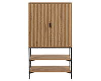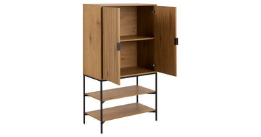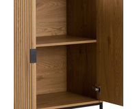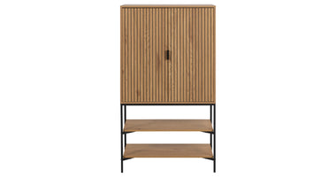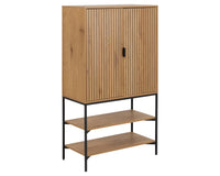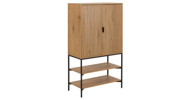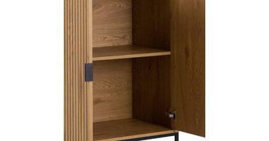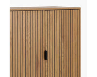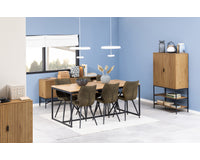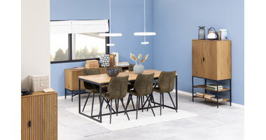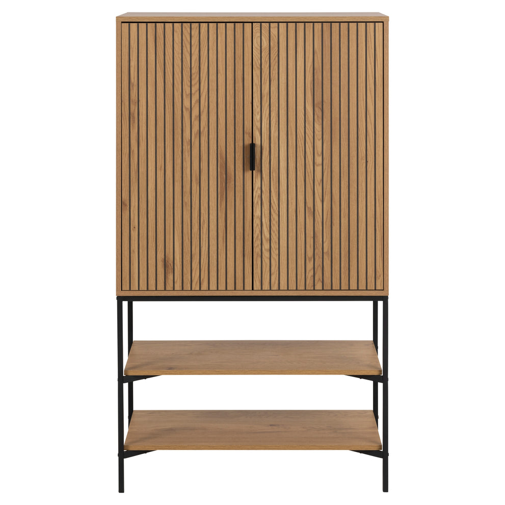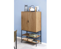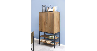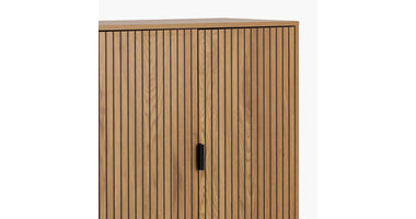 Deze kast Holeby laat zien hoe het moet. Met een onberispelijke, minimalistische look is het meer dan alleen een plek voor je spullen. Kijk maar eens naar die lamellenfronten met de elegante handgrepen in hetzelfde ruwe gepoedercoate metaal als het onderstel. De kast heeft verstelbare planken om je mooie spullen op te zetten.