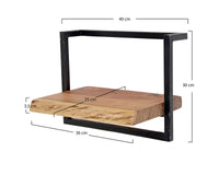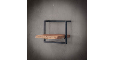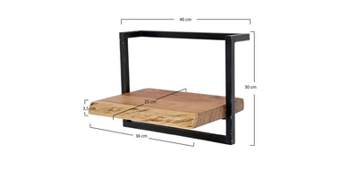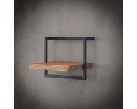 Deze wandplank Barby bestaat uit een houten acacia plankje (in diverse afmetingen) en is bevestigd aan een vintage stalen frame. De plank heeft aan het uiteinden een stoere afgeschuurde boomstamvorm. Deze wandplank is een onderdeel van de complete serie wandplanken, waardoor er verschillende decoratieve wanden te maken zijn. Zie voorbeelden.  De wandplank is middels twee bevestigingsogen eenvoudig aan de wand te monteren.
