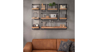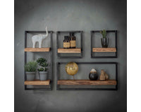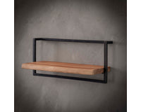Deze wandplank Barby bestaat uit een houten acacia plankje (in diverse afmetingen) en is bevestigd aan een vintage stalen frame. De plank heeft aan het uiteinden een stoere afgeschuurde boomstamvorm. Deze wandplank is een onderdeel van de complete serie wandplanken, waardoor er verschillende decoratieve wanden te maken zijn. Zie voorbeelden.  De wandplank is middels twee bevestigingsogen eenvoudig aan de wand te monteren.