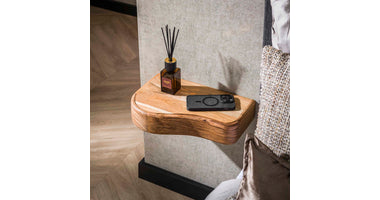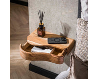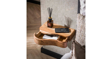 Breng een zachte, vloeiende dynamiek in de slaapkamer met de unieke vormgeving van nachtkastje Bron. Dit halfronde wandmeubel combineert de diepe, warme tonen van massief acaciahout met een slim, zwevend design dat rust creëert naast het bed. Het is de perfecte oplossing voor wie een warme, luxueuze sfeer wil neerzetten en tegelijkertijd de vloer optisch wil vrijhouden.